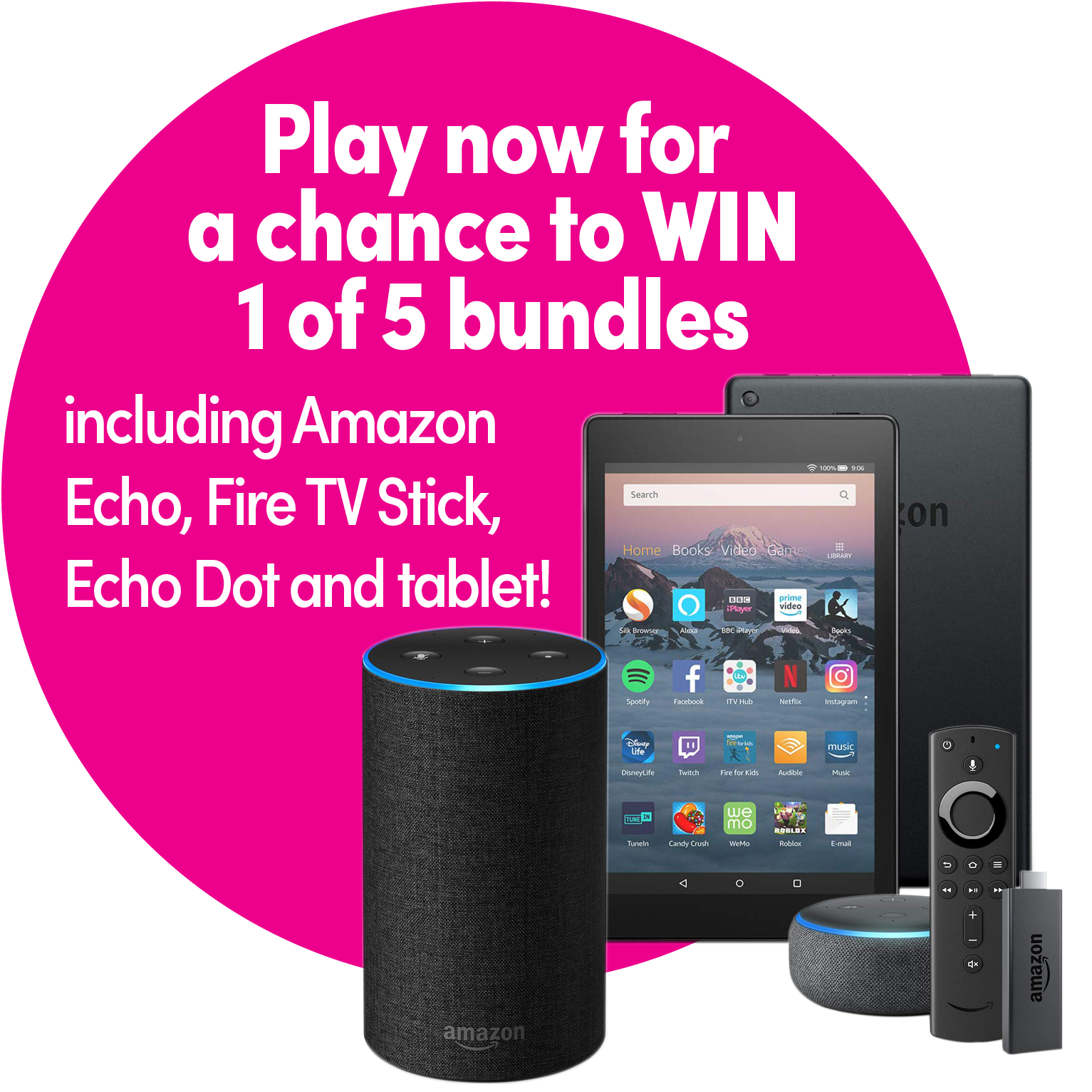 This autumn, 5 lucky West Berkshire Lottery players could win one of five amazing entertainment bundles. Each bundle consists of an Amazon Echo, a Fire TV Stick, an Amazon Echo Dot and a Fire HD 8 tablet.